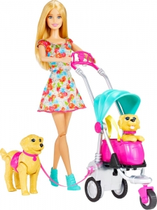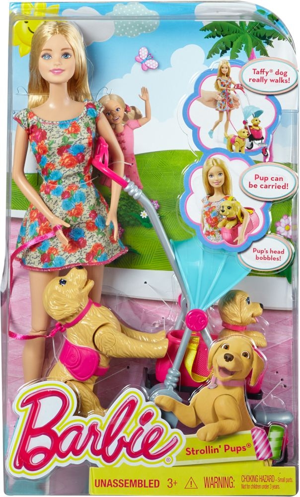 Mache einen tollen Spaziergang mit Barbies Hund und den süßen Welpen! - Taffy mit ihrem pinken Halsband und dem schicken Geschirr (beides nicht abnehmbar) ist bereit für einen langen Spaziergang. Die Welpen können aber müde werden. Barbie hat dafür einen tollen Hundewagen mit einer überraschenden Funktion - Mädchen können Barbies Hand am Wagen befestigen und ihn damit schieben, während der Kopf des Welpens hin- und herwackelt.
