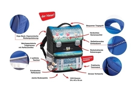 Käptn Kidd befindet sich auf diesem Tornister in Form eines großen Motivs und ist so ein cooler Blickfang. Er ist sehr robust und stabil und besteht aus abwischbarem Material. In dem großen Hauptfach sorgt die Trennwand dafür, das du immer Ordnung in deinem Ranzen halten kannst. Um Rückenschäden vor zu beugen ist, er besonders ergonomisch gepolstert. Auch die Schultergurte und der Tragegriff sind weich und gepolstert. Die Siggflasche könnte in eine der zwei Seitentaschen Platz haben und auch für Geldbörse und Schlüssel ist Platz in einer extra Fronttasche. Für Sicherheit sorgen die Katzenaugen und Reflektorstreifen.