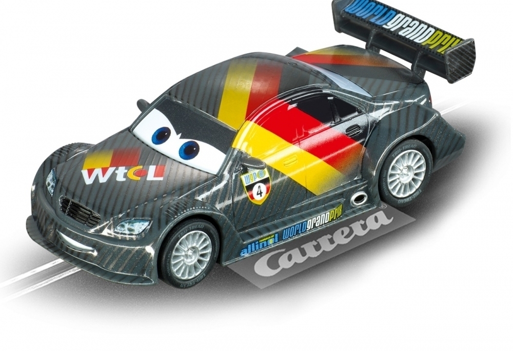 Du möchtest einen neuen Flitzer für Deine Carrera Go Rennbahn? Dann ist Max Schnell aus dem Pixar Movie Cars 2 genau das was Du brauchst. Detailgenau und originalgetreu macht er Deine Rennbahn zum Schauplatz eines wilden Rennens. Anthrazitfarbene Karrosserie, ein grimmiger Blick durch die Windschutzscheibe, Deutschland-Flagge auf dem Dach und der stylische Heckspoiler machen Maxi Schnell zum einem Augenschmaus.