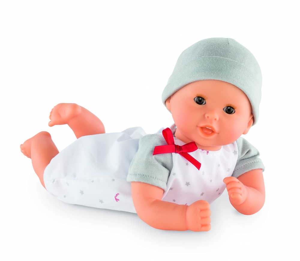Diese tolle, 30 cm grosse Puppe, interaktive Puppe mit 4 einfachen Funktionen, lässt jedes Mädchenherz höher schlagen. Mit ihrem weichen Körper ist sie gelenkig und man kann sie leicht anziehen, ausziehen oder gar wickeln. Das Gesicht, die Arme und Beine sind aus Vinyl und dank dem Granulat, mit dem die Puppe gefüllt ist, kann sie sogar aufrecht sitzen. Besonderheit: Wenn man sie hinlegt, schließt sie ihre braunen Augen! Sie sagt "Mama" und "Papa", gibt ein Küsschen und lacht. Durch einfaches Drücken auf den Bauch werden die Geräusche ausgelöst. Ausgestattet mit einem Overall sowie einer Mütze können die ersten Spielerfahrungen mit der Puppe umgehend beginnen. Das Sprachmodul kann entfernt werden. Funktioniert mit 3 Stk LR44 Batterien (inbegriffen).