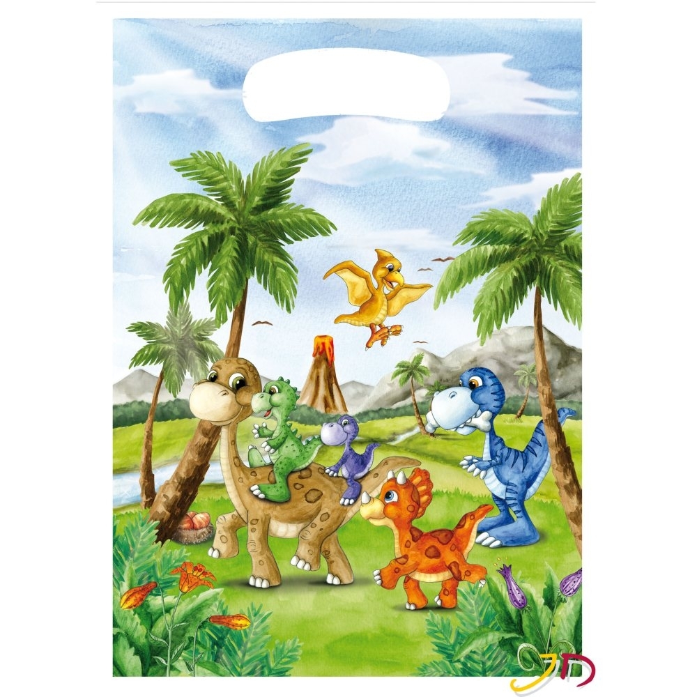 Kinder kommen und gehen zur Mottoparty mit vollen Taschen. Damit im Getümmel der tobenden Gäste keine kleinen Dinge wie Haarspangen, Brillen, Tombola-Gewinne oder Hausschlüssel verlorengehen, dienen die Partytüten mit Dinosaurier-Motiv als praktische Sammeltasche, die sogar beschriftet werden kann.