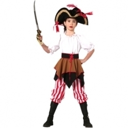 Das Fasnachtskleid Cowgirl Piratin zaubert aus braven Kindergartenmädchen mutige und sehr gefärliche Piratinnen, die vor keinem Abenteuer zurückschrecken! Das Kleid besteht aus einem weiten weißen Oberteil, das am Hals ausschnitt und an den Ärmeln mit Spitze besetzt ist. Verbunden damit ist ein zipfeliger kurzer Rock im Piraten Design der zweilagig über die rot-weiß gestreiften Hosen fällt. Ein breiter schwarzer Gürtel, in den Messer und Zubehör gesteckt werden können, wird in der Taille geschnürt.