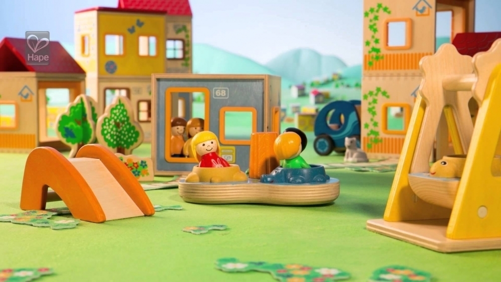 Ein Spielplatz mit Karussell, Schaukel und Rutsche und Platz zum Rennen und Spielen finden die beiden Kinderfiguren, die sich hier so richtig austoben können. Das Buch zum Set aus Holzteilen und Figuren gibt Vorschläge zu Spielen und Abenteuern, die auf dem Platz laufen können. Alle anderen Aktionen und Rollenspiele denken sich Kinder am allerliebsten selbst aus, und spielen diese nach.