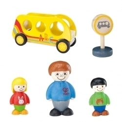 Der gelbe Schulbus hat einen lieben Fahrer, der weiß, das Kinder am allerliebsten zum Ausflug in seinen Wagen steigen. Abenteuer, wie sie die Spielfiguren auf den Fahrten erleben, schildert das beiliegende Buch zu den Holzteilen. Mit wenigen Accessoires und Figuren spielen Kinder Szenen nach, die sie tagtäglich erleben und hier immer wieder neu erleben.