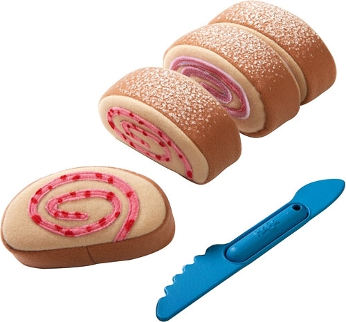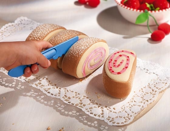 Eine frische, luftige Biskuitrolle darf auf dem Kaffeetisch nicht fehlen, wenn kleine Muttis Geburtstage der Kleinen feiern oder die Freundinnen zum Kaffeeklatsch eingeladen haben. Die goldbraune Stoffrolle mit verführerischem zartrosa Inhalt lässt sich mit dem Spielmesser in Portionsstücke zerlegen, indem die Klettverschlüsse zwischen den Einzelteilen gelöst werden.