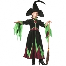 Diese herrlich kostümierte pfiffige kleine Hexe ist ein echter farblicher Hingucker: Mit schwarzem breitkrempigem Hexenhut und langem Kleid verwandelt sich ein kleines Mädchen schnell in eine mächtige und ansehnliche Zauberfrau. Das schwarze, am Oberkörper enganliegende Kleid, ist schwarzgrundig mit farblichen Einsätzen in den Farben Grün und Weinrot am Hals, Mieder, Rock und an den Ärmeln, die dadurch wirkungsvoll bei jeder Bewegung flattern.