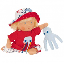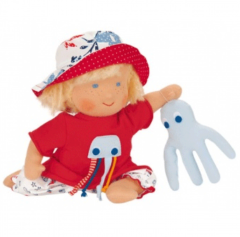 Die passende Kameradin für ein Kindergartenkind: Die Waldorfpuppe Maja ist eine blonde 30cm grosse Stoffpuppe mit Pagenfrisur, die mit einer weissen Krake spielt. Der weiche Körper ist mit Schurwolle gestopft, die niedlich sympathischen Gesichtszüge sind aufgestickt. Die Puppe aus Naturmaterialien eignet sich zum Spielen und als Schlaffreundin zum Ankuscheln.