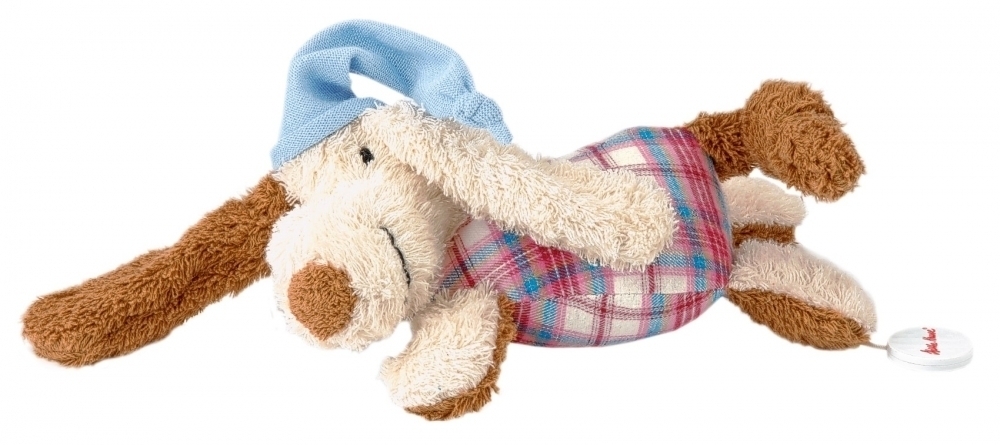 Mozarts Wiegenlied ertönt aus dem weichen Bäuchlein von Tiramisu, dem braunfelligen gemütlichen Schlafdackel mit Soundfunktion. Das Schlaftier aus weichem Frottee trägt eine Zipfelmütze auf dem Kopf, an dem bereits zwei Schlappohren baumeln, die die Kleinsten schon zum Greifen und Spielen animieren. Zum Kuscheln, Schlafen und Musik hören ist Tiramisu ein echter Kumpel.