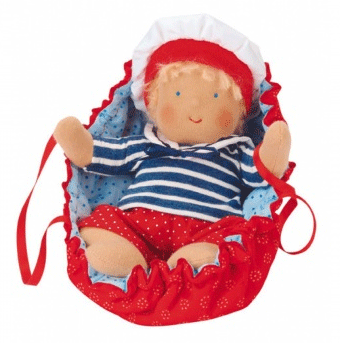 Was kuschelt sich da in seine Tragekörbchen? Ein knuddelig weiches Baby It's me, samt Strampler. Diese wunderschöne Ausführung mit blondem Bouclehaar und kecker Mütze in weiss-rot wurde von Hand gefertigt und kommt mit Tragekörbchen. Besonders hübsch in einer durchsichtigen Herztasche verpackt. Kann von Hand gewaschen werden.