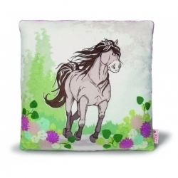 Ein Pferd im Galopp ist ein herrlicher Anblick, denn Schweif und Mähne fliegen im Wind und die Muskeln des Vierbeiners zeichnen sich in attraktiver Weise ab. Das Pferdebild im floralen Umfeld des ansonsten graubeige gehaltenen Kissen aus weichem Nikkistoff ist eine gelungene Bewegungsstudie des edlen Tieres und eine optische Bereicherung für jedes Kinderzimmer kleiner Pferdefans. Das quadratische Kissen mit Pferd lässt sich zum Kuscheln, Schlafen oder als Stütze beim Lesen und Fernsehen benutzen und sieht auf geklopft als Dekoration einfach toll aus!