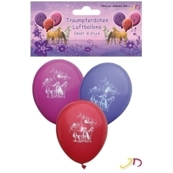 Als Dekorationselemente sind aufgeblasene bunte Luftballons von einer Kinderfeier nicht wegzudenken. Die Ballons in drei Farben tragen als weißen Aufdruck das Bildmotiv von Traumpferdchen und passen perfekt zum übrigen Partygeschirr zur Pferdchen-Serie.
