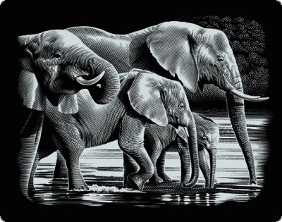 Dieses Kratzbild zeigt eine Elefanten Herde an einem Wasserloch. Die Tierwelt Afrikas ist faszinierend und Elefanten gehören zu den grössten lebenden Tieren auf der Erde.