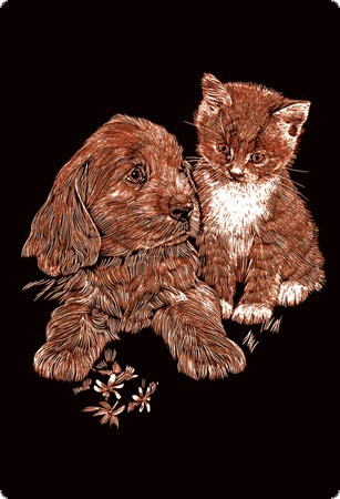 Dieses Kratzbild zeigt einen Hund und eine Katze. Hund ist auf die Katz gekommen und die zwei Freunde spielen in Harmony.