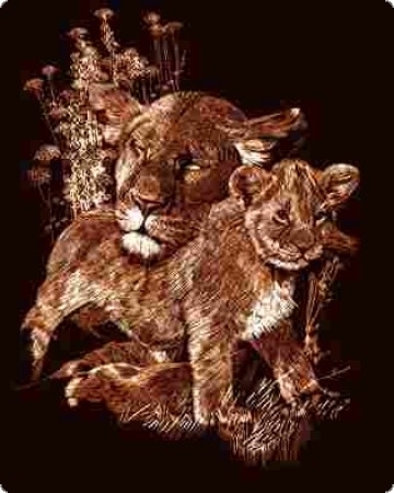 Dieses Kratzbild zeigt eine Löwenfamilie. Diese Löwenmama und ihr Baby schauen doch richtig süss aus.