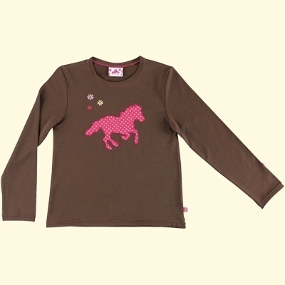 Wenn du ein Pferdefreunde Fan bist, dann haben wir hier ein tolles Langarmshirt in braun für dich. Es ist in der Grösse 128/140 und mit einem Pferdemotiv in pink bedruckt und bestickt. Weiterhin ist es mit Strassteinen verziert und du wirst darin bestimmt wunderschön aussehen.