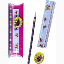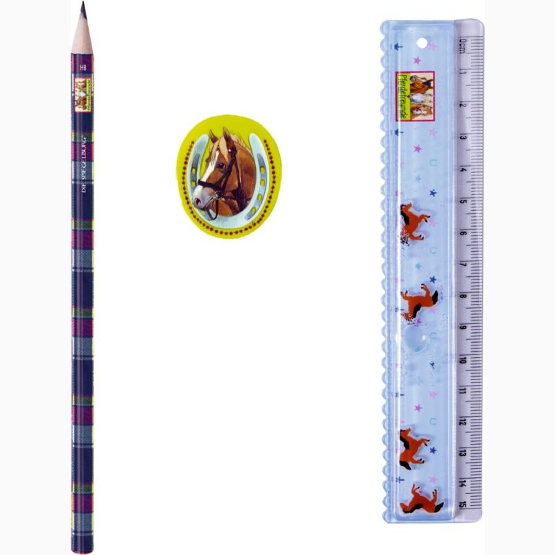 Set aus Lineal (gefüllt mit Wasser und schwimmenden Pferde-Figuren), Bleistift und Radiergummi. Verpackt in transpartenter Box