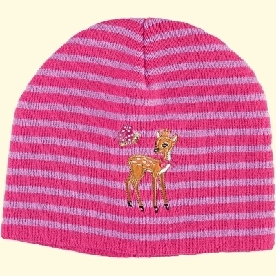 Um die Ohren auch in der kalten Jahreszeit zu schützen, gibt es jetzt für alle Mädchen die passende Mütze. Und wem das noch nicht genug ist, in unserem Shop sind noch ein Prinzessinnenschal und Handschuhe erhältlich. Die Mütze ist pink und auf der Vorderseite ist das Rehkitz als Aplikation befestigt.