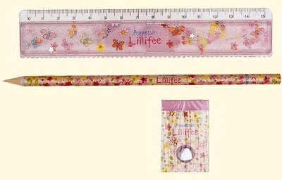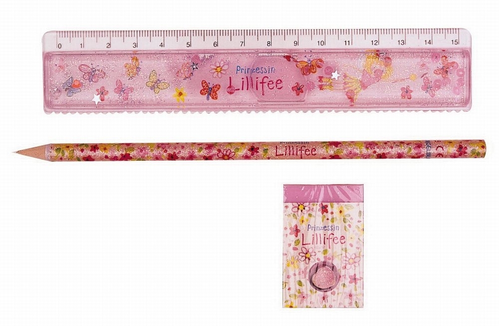 Mit dem rosafarbenen Lillifee-Linealset sind kleine Prinzessinnen für den Schulbesuch gewappnet, denn die üblichen Zeichen- und Schreibgeräte wie Lineal, Radiergummi und Bleistift gibt es auch in ladylike edler Ausführung: Das Lineal ist gefüllt mit einer Wasserlösung, die Perlen und Glitzerelemente enthält, die bei jeder Bewegung mitschwimmen. Der HB-Bleistift ist rosafarben und beglimmert, das Radiergummi erhält prunkvolles Aussehen durch ein integriertes Herz-Steinchen.