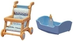 Kinderwagen und Schaukelwiege inkl. Schoppenflasche.