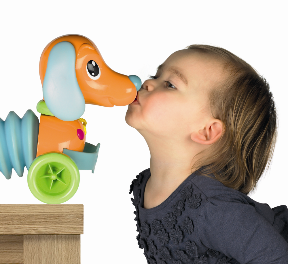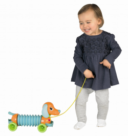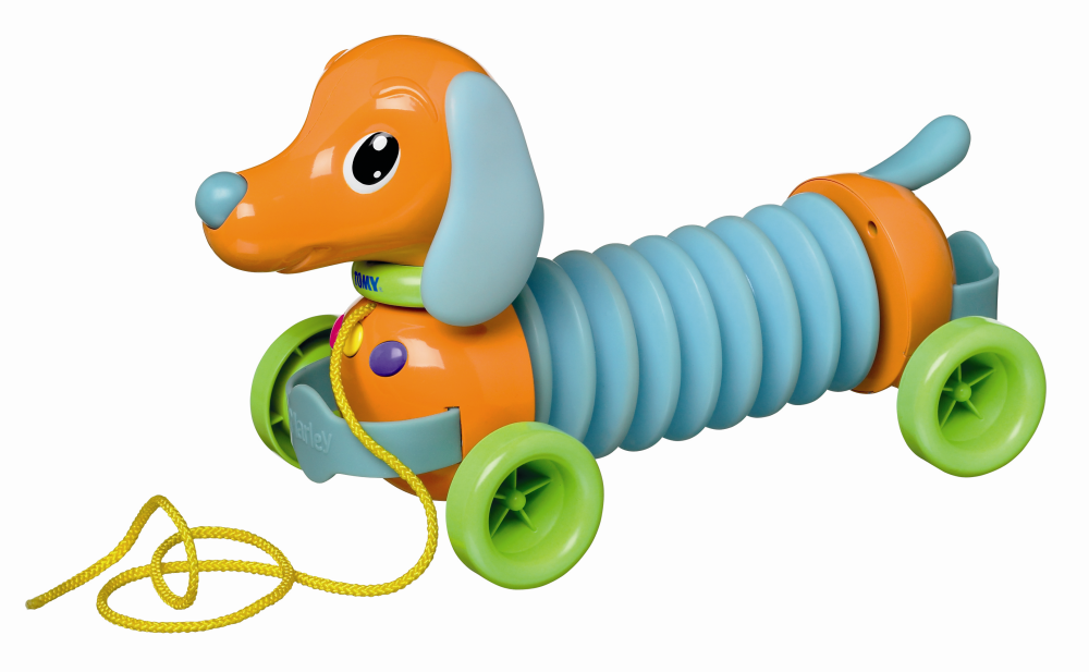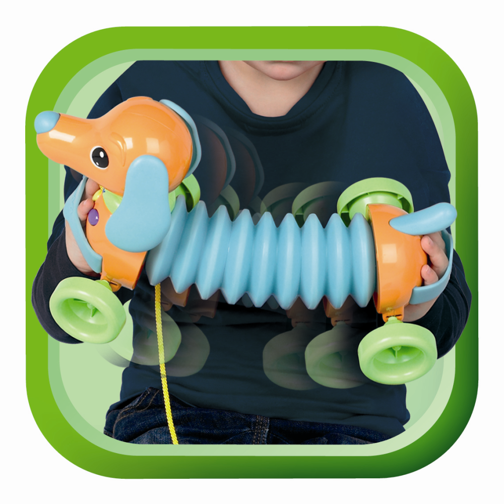 Dieser mobile Wackel-Dackel eignet sich mit seinem Zieharmonika-Körper sogar zum Musizieren! Das Zieh-Tier besteht aus wasserfestem Kunststoff und überlebt damit auch Nächte auf der Terrasse oder Spritzer von Getränken oder Duschwasser. Als Weggefährte für die Kleinen, die gerade erst laufen können, ist der musikalische Hund ein Spielzeug, das durch seine Möglichkeiten lange für Beschäftigung, Bewegung und Interesse sorgt.